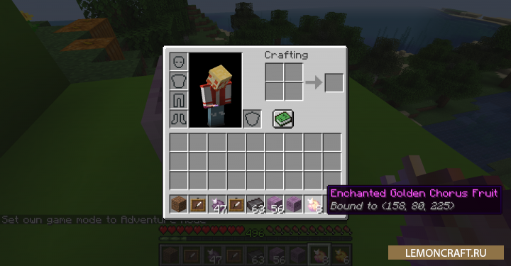 Мод на новый тип телепортации Chorus Links добавляет в игру возможность осуществлять телепортацию с использованием блоков Хоруса. Для этого вам нужно создать блок Chorus Links на который вы сможете телепортироваться употребив плод хоруса. Ести три типа плодов: простой, действует на расстоянии 64 блока, золотой на расстояние 512 блоков и зачарованный на расстояние 1024 блока.